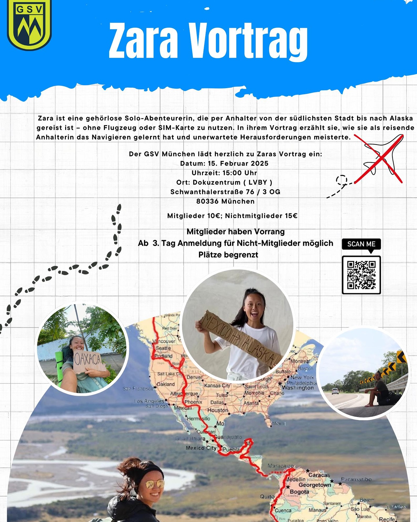 Die Taube Zara Xuejia Zacsko aus Schweden wird in München einen Vortrag über sich und ihre Reise als Anhalterin von der südlichsten Stadt Argentiniens bis nach Alaska halten. Wir freuen uns, dass Zara ihre spannende Geschichte in einem Vortrag präsentieren kann. Es wird ein aufregender und inspirierender Vortrag!